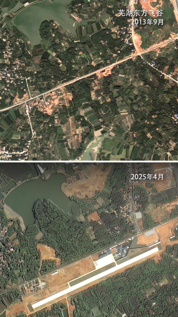 遙感衛星拍攝顯示東方飛谷航空飛行營地的飛機跑道等基礎設施在加快完善。新華社發