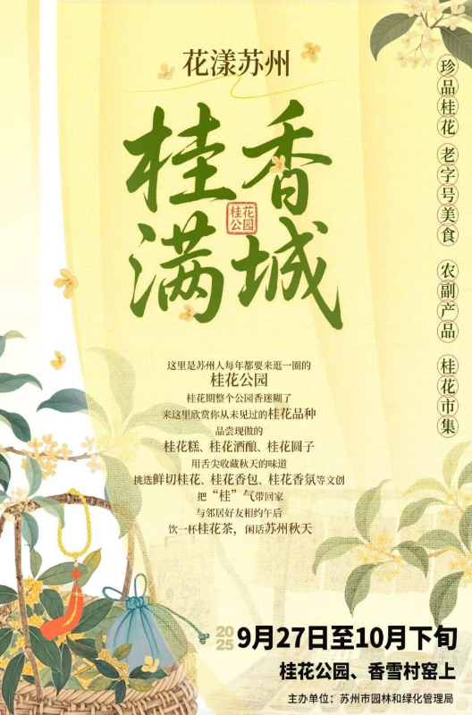 9月27日起,由蘇州市園林和綠化管理局主辦的“花漾蘇州 桂香滿城”系列活動將正式啟動。作為系列活動中最貼近市民生活的重頭戲,桂花市集將于9月27日至10月下旬每天在蘇州桂花公園舉行。不同于普通市集,本次活動以“桂花”為脈絡,深度融合美食、民俗、非遺與文創,意在點燃煙火氣,打造一個“可逛、可嘗、可玩、可感”的消費新場景。期間,虎丘金秋木樨市集、上方山金秋賞花市集、古典園林非遺手作市集將陸續推出,同步聯動張家港、常熟、太倉等板塊開展桂花相關主題活動,聯動全市園林景區,打造一個融賞秋景、品文化、促消費于一體的金秋盛會。