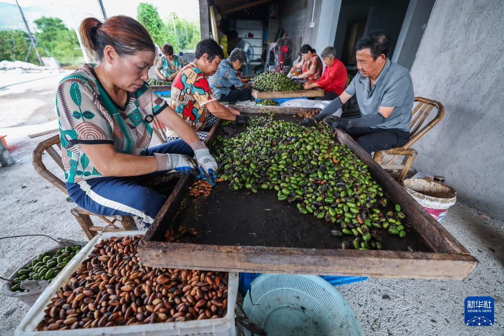 9月18日,在諸暨市趙家鎮明樂果業專業合作社,當地農戶在進行香榧青果剝殼。