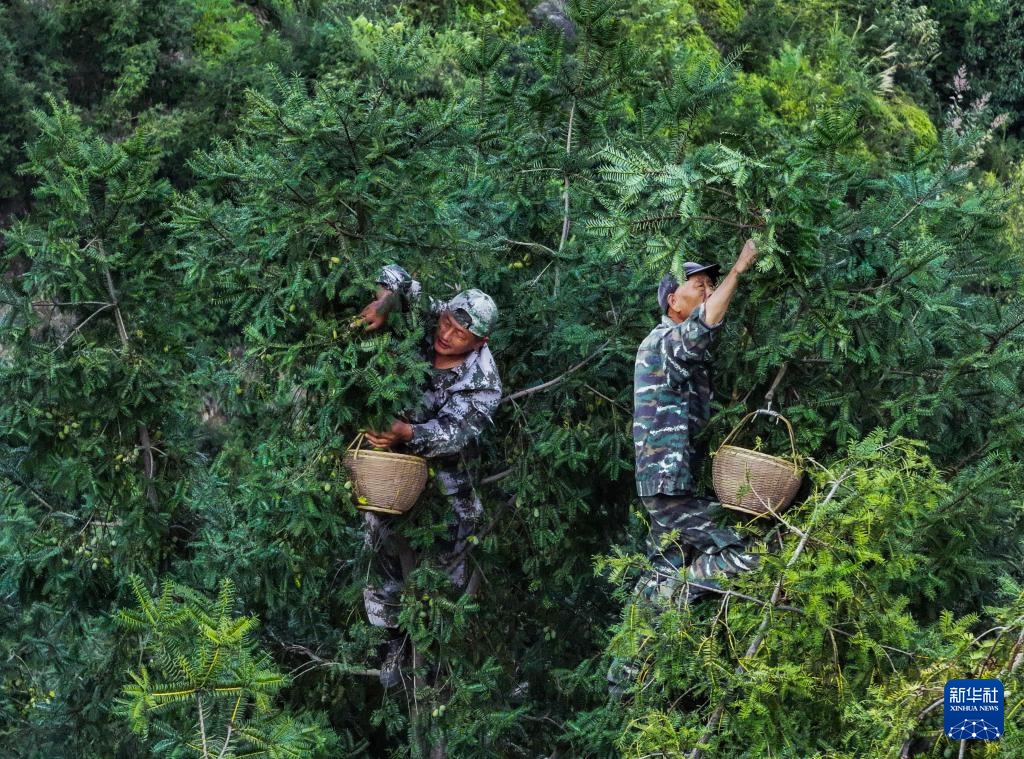 9月18日,諸暨市趙家鎮宣家山村的香榧種植戶在樹上采摘香榧青果(無人機照片)。