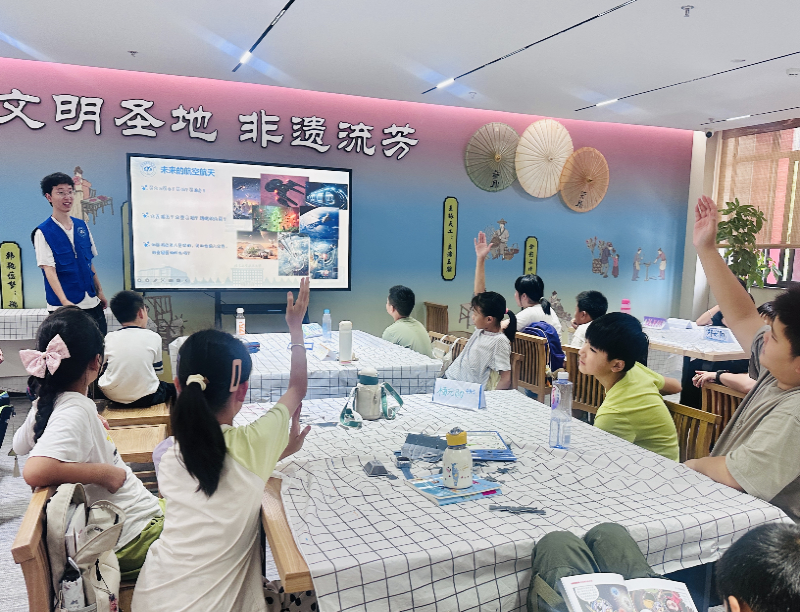 北航學生志愿者在黨服給暑托班的孩子們講授航空知識科普課