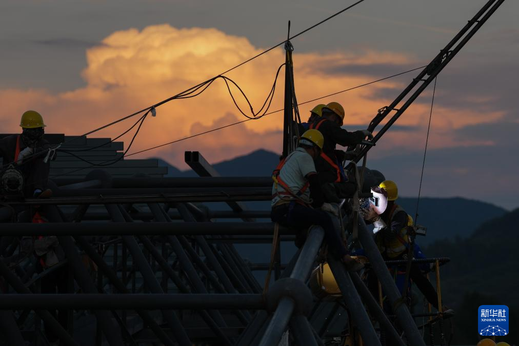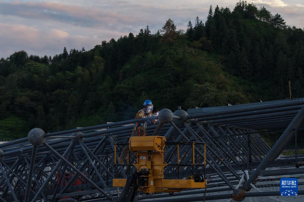 10月14日,建設者在衢麗鐵路東西巖站站房候車廳鋼網架上進行焊接作業(無人機照片)。