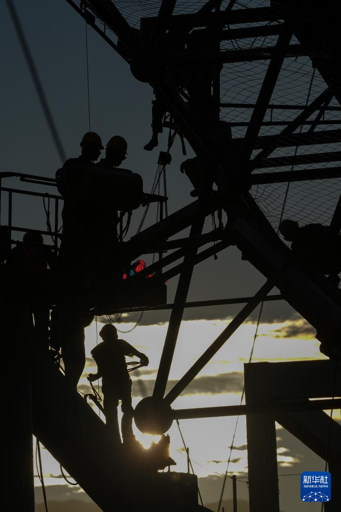 10月14日,建設者在衢麗鐵路東西巖站站房候車廳鋼網架上作業。