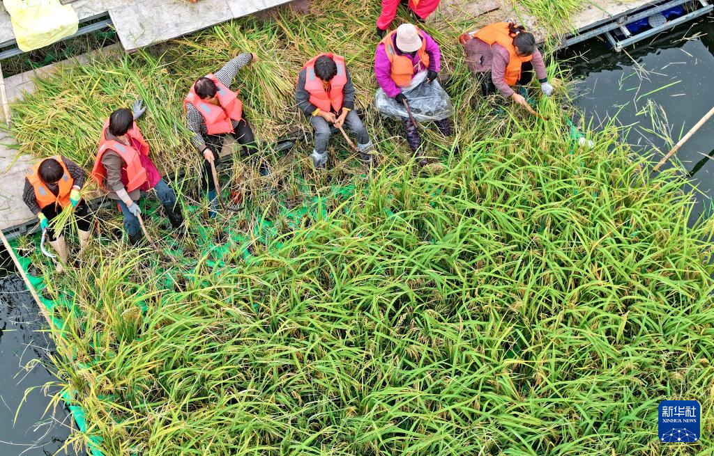 10月14日,工人在淮南市鳳臺縣顧橋鎮采煤沉陷區水面上收獲漂浮式水稻(無人機照片)。