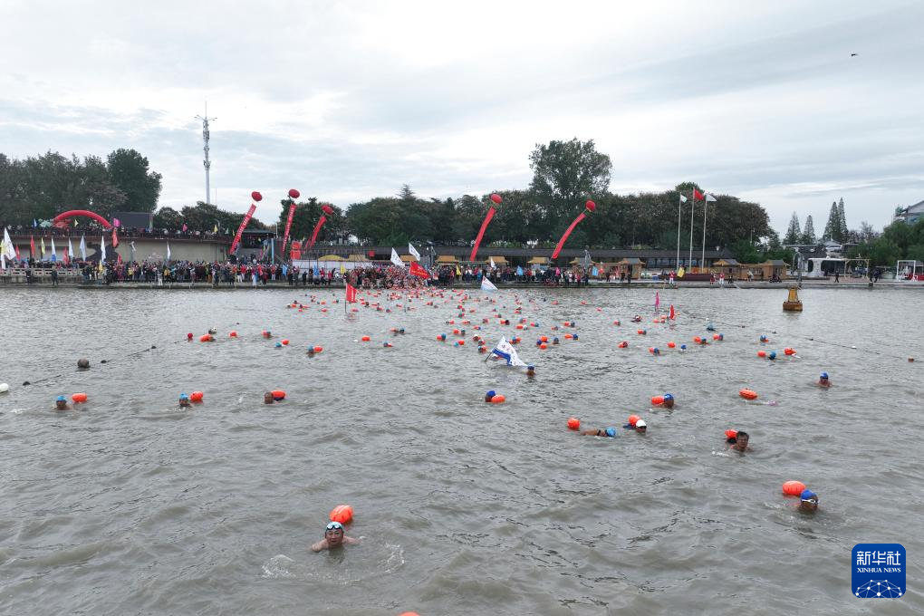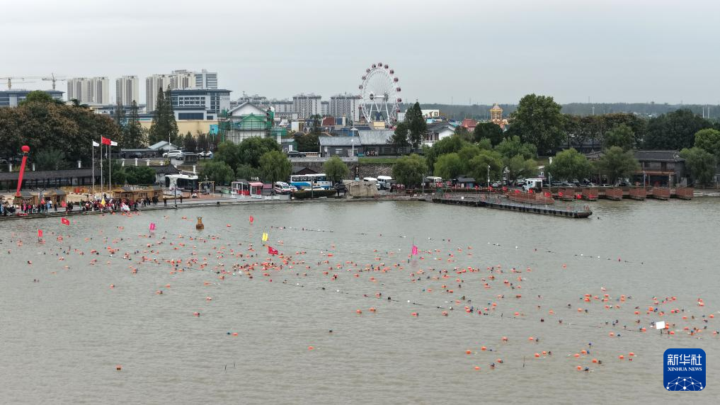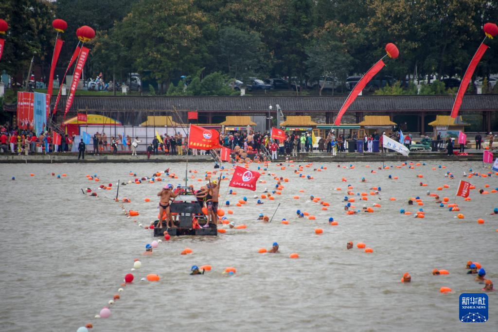 10月19日,選手在江蘇省淮安市洪澤區漁人灣浴場參加游泳比賽。