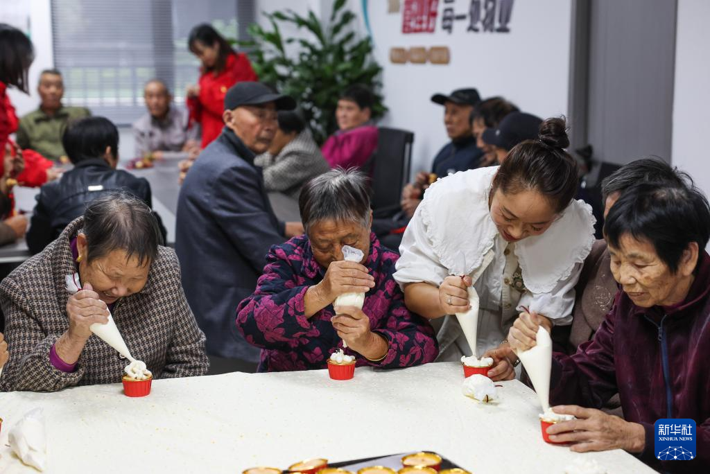 10月21日,志愿者在教老人制作紙杯蛋糕。